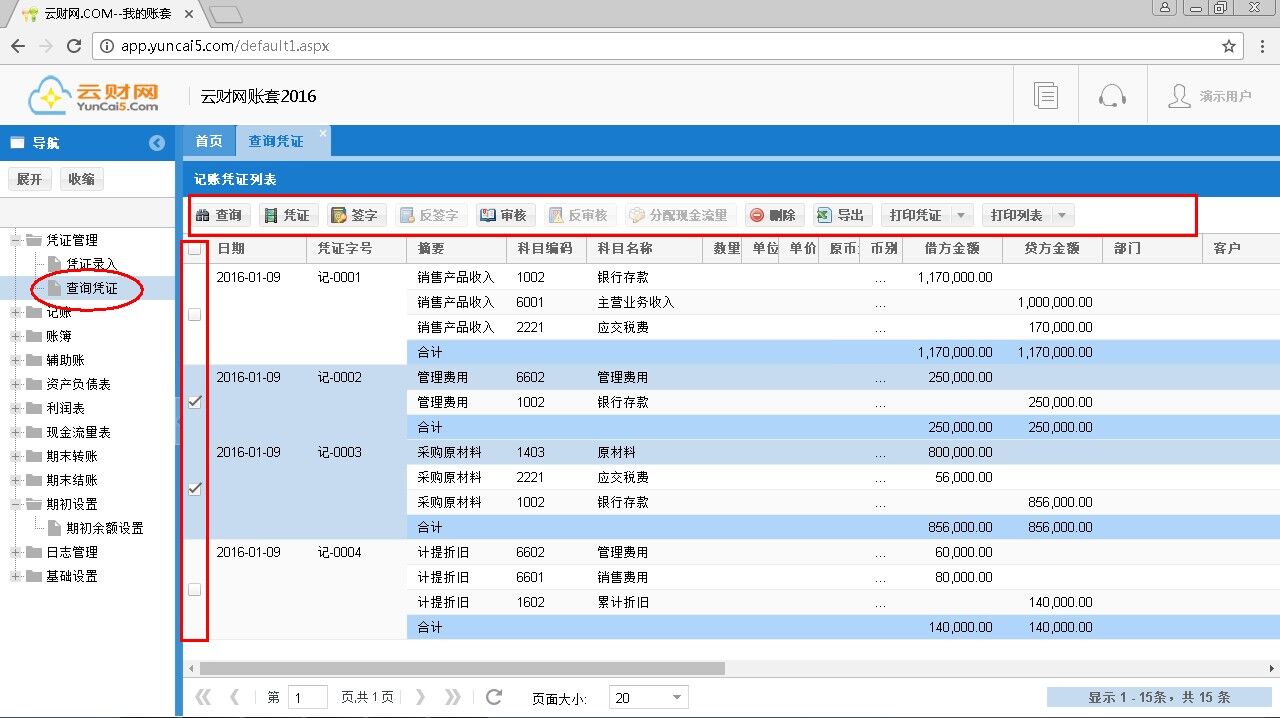 【账簿--总账】→ 【配置查询】→ 选择相应科目,系统自动生成该科目的总账。在总账界面,也可以直接展开总账的明细账,并从明细账展开凭证。