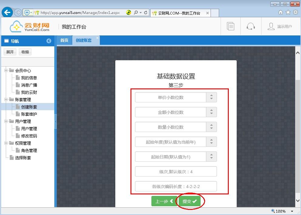 【我的工作台--账套维护--创建账套】→ 输入账套编号与名称→ 单位名称、所用会计制度和税务规模(默认本位币代码和名称可以不写)→ 数据小数位数默认是2位,账套默认开始年度为当年、默认开始期间1月,会计科目编码级次及各级编码长度可以不用输入、使用默认值→【提交】成功后选择新建的账套名称登录