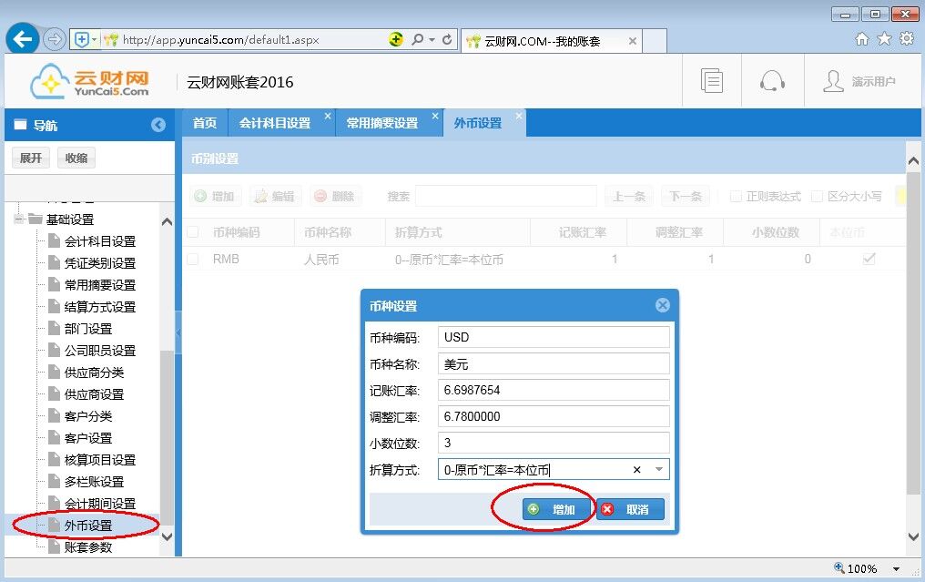 【基础设置--外币设置】→ 默认已经存在本位币的设置。点击【增加】按钮,开始设置币别信息。币别编码请使用大写字母。