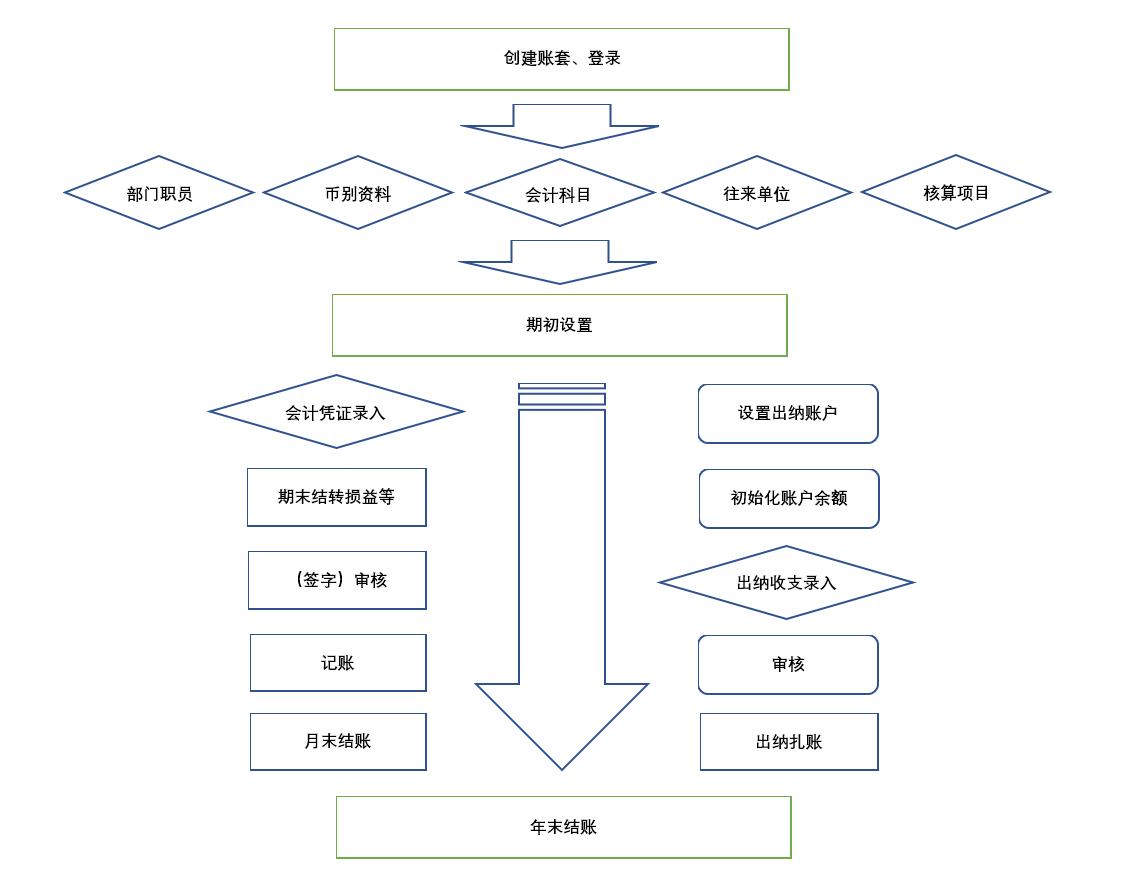【出纳业务操作流程】:设置出纳账户 → 初始设置 → 出纳收支凭证录入 → 审核 → 出纳轧账(反轧账);